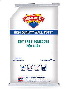 Bột trét Homecote Wall Putty interior là bột trét (bột bả) tường nội thất dùng làm phẳng, mịn bề mặt trước khi thi công sơn.Sản phẩm này thích hợp cho thi công trên bề mặt hồ vữa, xi măng, thạch cao với những đặc tính: